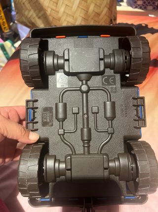 Camión de juguete de plástico con diseño divertido y colorido. - Parte delantera naranja con cara sonriente y llamas. - Parte trasera azul con detalles de carreras y número 88. - Asa naranja para facilitar el transporte.