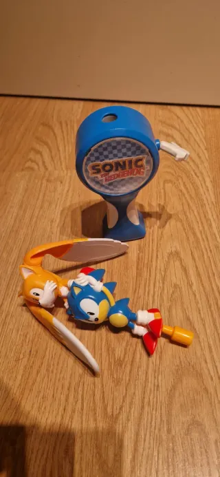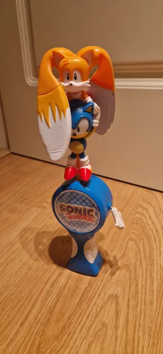 Divertido juguete de Sonic y Tails, personajes icónicos de los videojuegos. - Figuras de Sonic y Tails. - Base azul con diseño de Sonic. - Mecanismo para volar o girar.