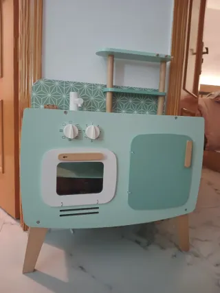 Bonita cocina de juguete de la marca Vertbaudet en color verde. Algunas marcas de uso; una de las ruedas del horno está floja. - Diseño moderno y atractivo. - Fabricada en madera. - Incluye accesorios como se ve en las fotos. Medidas Alto 75 Ancho 56 Fondo 28