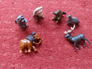 Conjunto de figuras de animales para coleccionar o jugar. - Incluye un mapache, un primate, un castor, un mamut, un ciervo y otra figura. - Fabricados en plástico.