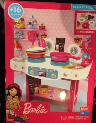 Divertida mini cocina de juguete con temática de Barbie. Ideal para los más pequeños. - Incluye accesorios de cocina como ollas, sartenes y utensilios. - Diseños coloridos con imágenes de Barbie. - Base con botones y pantalla decorativa.