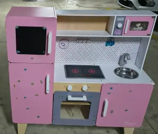 Divertida cocina de juguete en color rosa, ideal para los más pequeños. - Diseño con nevera, horno y microondas. - Incluye fregadero y placa de cocina. - Detalles decorativos como reloj y pizarra.