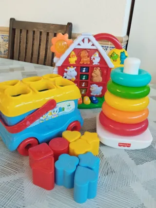 Pack de juguetes educativos para niños. - Casa de campo con animales sonoros. - Camión con formas para encajar. - Torre de aros. Cómo nuevos.