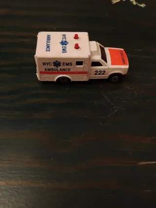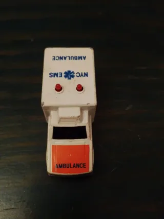 Pequeña ambulancia de juguete con detalles de NYC EMS. - Diseño blanco con detalles en azul. - Dos luces rojas en la parte superior. - Panel frontal naranja con la palabra AMBULANCE.