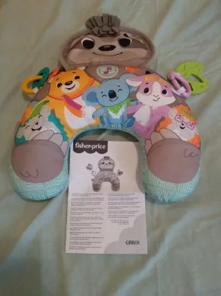 Cojín de apoyo para bebés de la marca Fisher Price, modelo GR001. Tiene música y vibración. Ideal para cuando los bebés empiezan a levantar la cabeza ellos solos. Presenta un diseño con animales y un personaje central de perezoso. Posibilidad de entrega en mano en Coruña, Gijón o Salamanca (consultar).