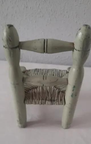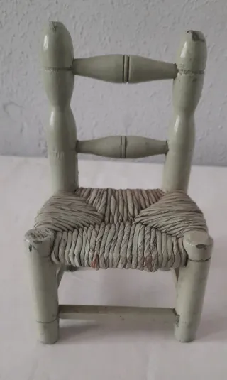 Pequeña silla de juguete con un diseño clásico y encantador. Ideal para coleccionistas o como elemento decorativo. - 22 cms de alto - Estructura de madera pintada en color verde pálido. - Asiento tejido con cuerdas o fibra natural. - Respaldo con dos travesaños.