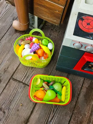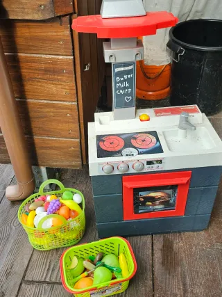 Divertida cocinita de juguete con varios accesorios para horas de juego. - Incluye una cesta con frutas y verduras. - Otra cesta con más alimentos y utensilios. - Diseño colorido y atractivo.