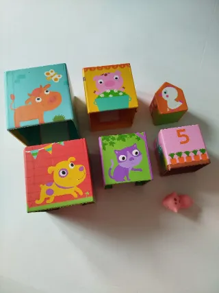 Juego de cubos apilables con diseño de casa. - Piezas de cartón con ilustraciones. - Incluye figuras de cerditos. - Fomenta la creatividad y el juego.