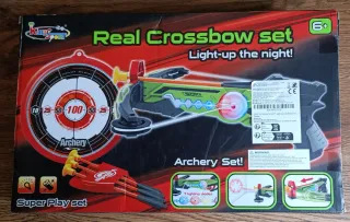 Set de ballesta de juguete con luces. Funcionamiento: Requiere pilas tipo AAA para las luces. - Incluye ballesta y accesorios. - Diseño deportivo en verde y negro. - Edad recomendada: 6+ años.