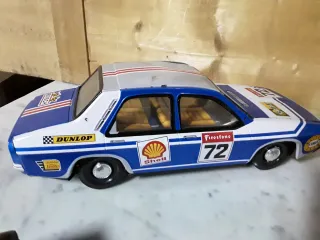 Coche de juguete clásico con decoración de carreras. - Diseño vintage. - Detalles de patrocinadores como Shell, Firestone y Dunlop. - Número de dorsal 72. Caja corral 11