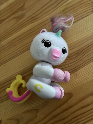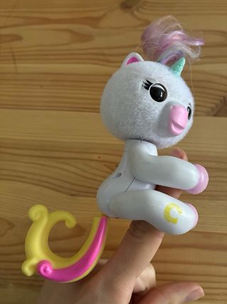 Un unicornio interactivo de la marca Fingerlings. Este juguete tiene un acabado suave y detalles brillantes. - Cuerpo blanco con pelaje esponjoso. - Cuerno y orejas rosas. - Crin y cola multicolor con tonos pastel. - Patas delanteras y traseras con acabado brillante rosa. - Detalle de letra 'C' amarilla en una de las patas.