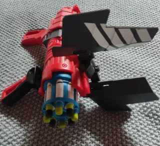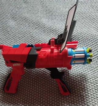 Pistola de juguete de la marca Boomco, con un diseño llamativo en color rojo y azul. - Tambor giratorio con capacidad para varios proyectiles. - Empuñadura ergonómica para un agarre cómodo. - Mecanismo de disparo integrado.