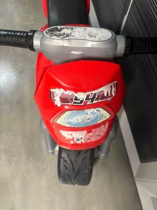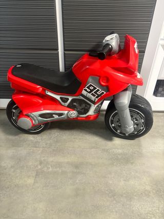 Moto de juguete de color rojo brillante, con detalles plateados y el número 94 en los laterales. Ideal para los más pequeños. - Diseño deportivo. - Asiento negro. - Ruedas de goma. -En Amazon vale casi 60 euros -Las pegatinas que están mal, se quitan y se pueden poner otras nuevas -Recogida en Jaén capital