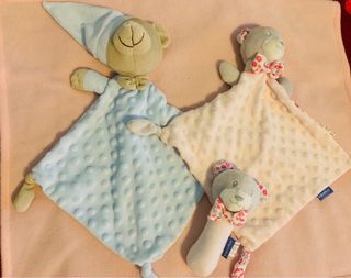 Conjunto de dou dou y sonajero con forma de osito. - Dou dou azul con gorrito. - Dou dou rosa con lazo. - Sonajero rosa con lazo.