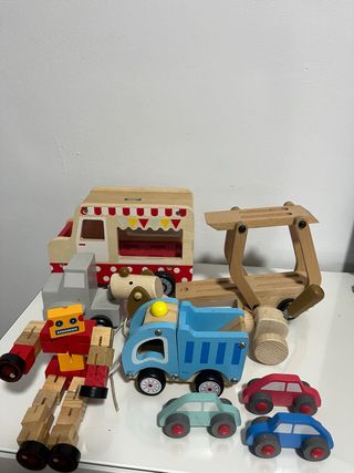 Conjunto de varios juguetes de madera. - Camión de juguete de madera azul. - Coche de juguete de madera rojo. - Coche de juguete de madera azul. - Coche de juguete de madera verde claro. - Robot de juguete de madera rojo y amarillo. - Camión de helados de madera. - Grúa de madera.