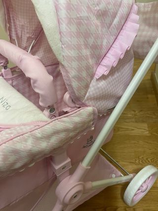 Carro de juguete para muñecas de la marca De Cuevas. - Diseño en color rosa con estampado. - Incluye capazo y cesta. - Ruedas para facilitar el movimiento.
