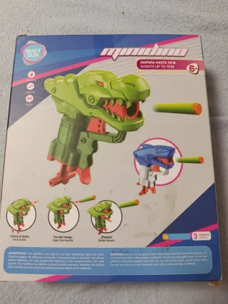 Divertida pistola de juguete con diseño de dinosaurio. - Incluye dardos de espuma. - Colores verde, rojo y naranja. - Nueva sin abrir - +6 años - De tamaño pequeño