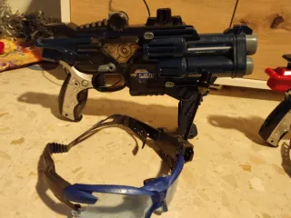 Set de pistolas de juguete con gafas. - Pistola azul con gafas, la pistola azul no funciona. - Pistola roja con gafas, funciona perfectamente con sonido y luces.
