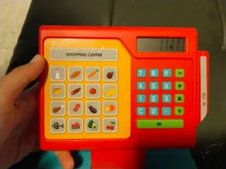 Divertida caja registradora de juguete para los más pequeños. Incluye accesorios para jugar a la tienda. - Caja registradora de plástico en color azul y roja. - Teclado numérico y pantalla en perfecto funcionamiento. - Cajón extraíble con monedas y billetes de juguete. - Escáner de mano rojo. - Calculadora amarilla. - Impresora de recibos amarilla.
