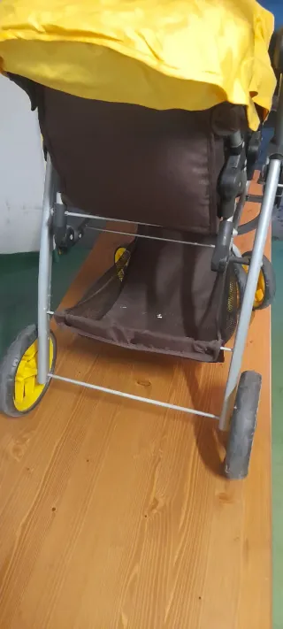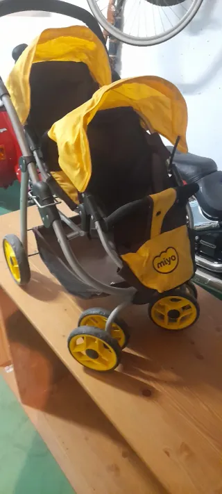 Cochecito doble de la marca Miyo en color amarillo y negro. - Capotas independientes. - Ruedas delanteras giratorias. - Cesta de almacenamiento inferior.