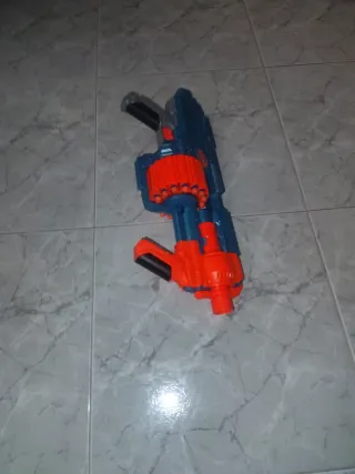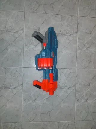 Pistola Nerf Shockwave en llamativos colores azul y naranja. Un juguete divertido para coleccionar o jugar. - Diseño característico de Nerf. - Tambor giratorio para dardos. -Llena entera con balas