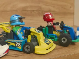 Conjunto de cinco coches de carreras de Playmobil, listos para la competición. - Incluye cinco figuras de pilotos. - Cada coche tiene un diseño y color diferente. - Los coches son de plástico resistente.