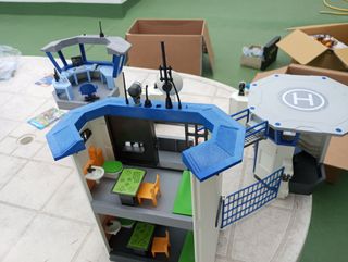 Completo set de Playmobil de una estación de policía con helipuerto. - Incluye torre de control con pantalla. - Helipuerto con señal H. - Celdas y puerta de acceso. - Escaleras y barandillas. - Accesorios como conos, señales y herramientas.