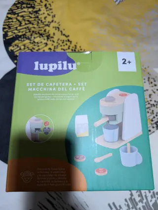 Set de cafetera de madera de la marca Lupilu, sin abrir con su precinto. Comprada en noviembre 2025. Ideal para regalo. - Juguete resistente de madera. - Incluye cafetera, taza, café y leche.