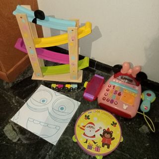 Lote de juguetes variados. - Pista de madera con coches. - Caja registradora de Minnie Mouse. - Tambor con diseño navideño. - Hojas de colorear con diseño de Minions. Zona Las Alvaravaneras. Más juguetes en mi perfil.