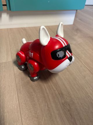 Divertido perro robot de juguete con un diseño moderno y llamativo. Funciona con pilas, se le iluminan los ojos y camina. - Color rojo brillante con detalles blancos. - Aspecto de perro bulldog con gafas de sol. - Número 01 en el lomo.