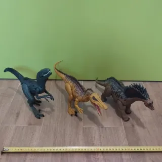 Colección de figuras de dinosaurios de juguete de diferente tamaño: -) Los 3 grandes de unos 35 CMS de largo, articulados y uno de ellos con luces (ojos) y sonidos (ruge) -) Los dos medianos de unos 19 CMS de largo, no articulados -) Los pequeños de unos 10 CMS de largo, no articulados