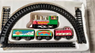 Conjunto de tren de juguete con temática navideña, perfecto para coleccionistas o para decorar. - Locomotora roja y verde con detalles dorados. - Vagón verde con escena de Papá Noel y renos. - Vagón amarillo con texto Merry Christmas. - Vagón rojo con motivos navideños. - Incluye vías de tren curvas y rectas. No pilas, pues no es eléctrico Ver sin compromiso Solo venta directa en zona Mesa y López plaza de España Puedes ver más artículos en mi perfil