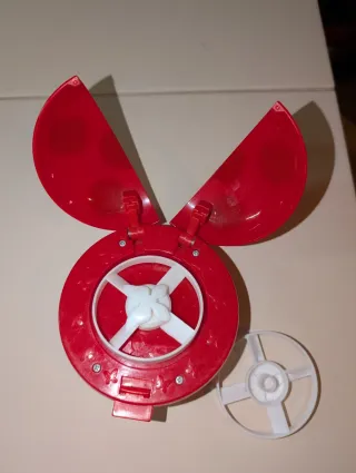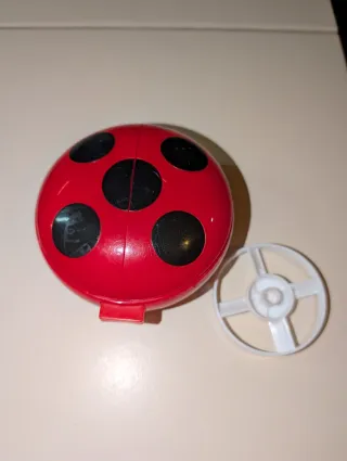 Ladybug Lanzador de Akumas. Juguete que al presionar el botón se abre y lanza un disco que vuela a la vez que suena la música de la serie de dibujos Ladybug. Funciona perfectamente. Con dos discos de mariposa. También tengo el disfraz de Ladybug en mi perfil.
