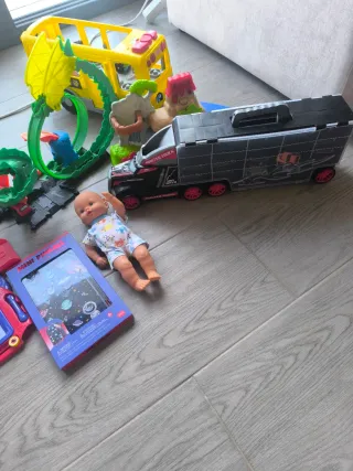Conjunto de juguetes variado para horas de diversión. Todo viene tal y como en la foto, podría falta alguna pieza o accesorios de algunos, pero son totalmente funcionales. - Autobús escolar amarillo. - Pista hot wheels dragón city - Camión negro con muchos coches dentro -Carro de compra con frutas y verduras. - Muñeca - pizarra magnetica - minipinball - cuartel general patrulla canina