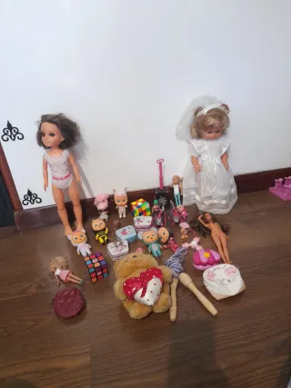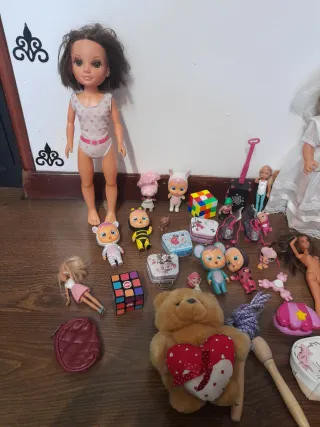 Lote variado de juguetes para niña, ideal para coleccionar o regalar. - Incluye varias muñecas de diferentes tamaños. - Figuras pequeñas y accesorios. - Peluche de oso con corazón. - Cubos de colores y cajas decoradas.