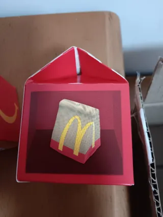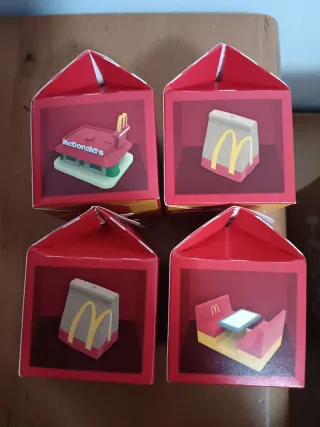 Vendo cajitas de juguetes minis de Happy Meel de McDonald's sin abrir o cambio una por la de la bandeja con manzana (tengo repetidas para cambiar o vender 4: edificio restaurante, mesa, bolsa para llevar (fotos. una reservada) y cartel de Auto Servicio (este sin caja). También te las entrego a 2.5 euros cada una. Si te llevas los 4 por 9 euros con regalo de miniaturas (última foto).