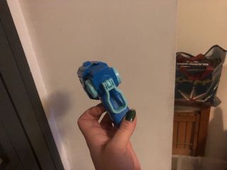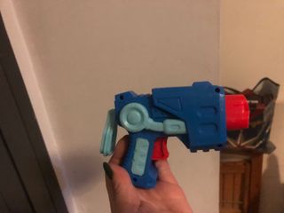 Pistola de juguete con un diseño llamativo en colores azul, rojo y claro. - Mango ergonómico. - Gatillo rojo. - Cañón con detalles.