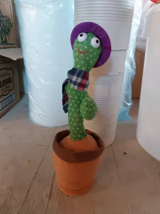 Divertido cactus bailarín con sombrero y bufanda. - Peluche suave y colorido. - Diseño de cactus con ojos saltones y sonrisa. - Incluye sombrero morado y bufanda a cuadros. Sin cable de carga. Repite lo que dices con voz aguda y tiene mas de 200 canciones