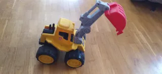 Excavadora de juguete de color amarillo brillante, con pala roja y detalles en gris. - Pala frontal articulada. - Ruedas grandes y resistentes.