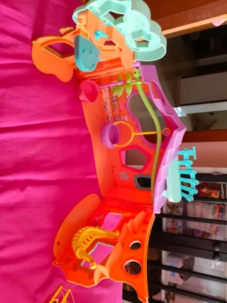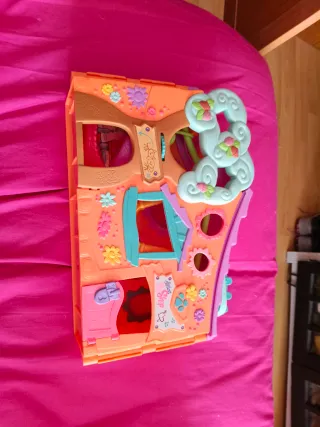Casa de juguete de la marca Little Pet Shop, con un diseño colorido y divertido. - Estructura principal de color naranja. - Detalles decorativos de flores y huellas. - Ventanas y puertas de colores. - Elementos decorativos en forma de árbol y nubes.