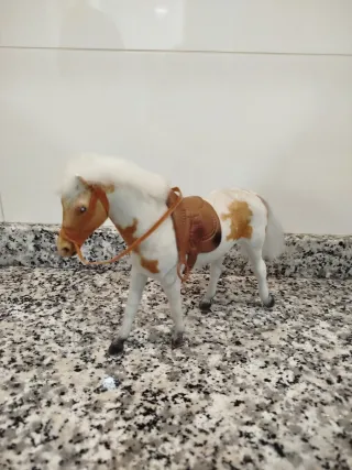 Caballito de juguete con detalles realistas y silla de montar. - Diseño de caballo pinto. - Melena y cola blancas. - Silla de montar de color marrón.