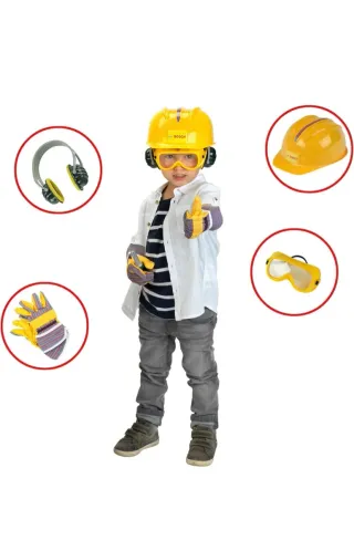 Banco de trabajo infantil de la marca Bosch, ideal para pequeños manitas. Incluye accesorios. - Altura: 100 cm - Anchura: 62 cm - Profundidad: 42 cm - Incluye casco amarillo, taladro de juguete, herramientas y más.