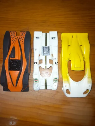 Lote de tres carrocerías de Scalextric, listas para personalizar o reparar. - Carrocería naranja y negra con diseño geométrico. - Carrocería blanca con franjas negras y detalles de patrocinadores. - Carrocería amarilla con base blanca.escala 1/32. Lo que ves es lo que compras. Como sé puede verse en las fotos. Más artículos en mi perfil