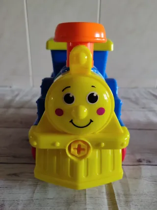 Tren de juguete Thomas. - Diseño azul y rojo. - Cara sonriente. - Chimenea negra.