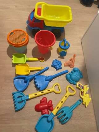 Conjunto de juguetes para disfrutar en la playa. Incluye varios accesorios para construir y jugar. - Camión volquete amarillo y azul. - Cubo rojo. - Pala verde. - Pala amarilla. - Rastrillo azul. - Molde de pez azul. - Molde de cangrejo azul. - Pistola de agua naranja. - Pistola de agua amarilla. - Avión rojo. - Regadera amarilla y azul. - Tamizador naranja y azul.