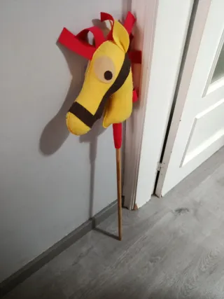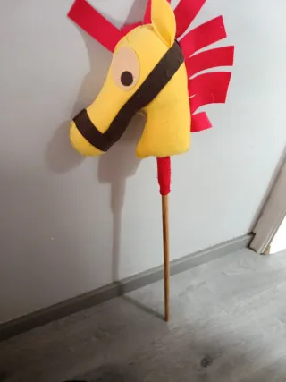 Caballo de juguete con palo de madera. - Cabeza de peluche amarilla. - Crin y detalles en rojo y marrón. - Palo de madera para jugar.