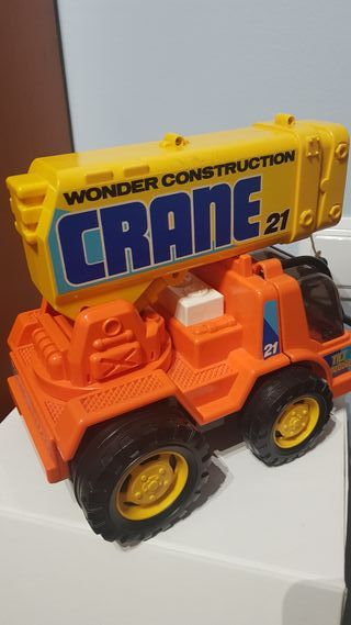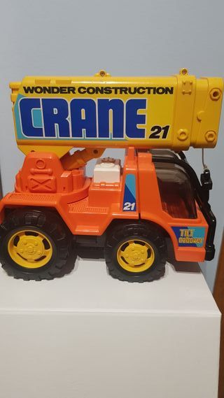 Camión grúa de juguete de la marca Wonder Construction. - Diseño de camión de construcción. - Grúa de color amarillo con detalles en azul. - Cabina de color naranja. - Ruedas grandes de color negro con detalles amarillos.