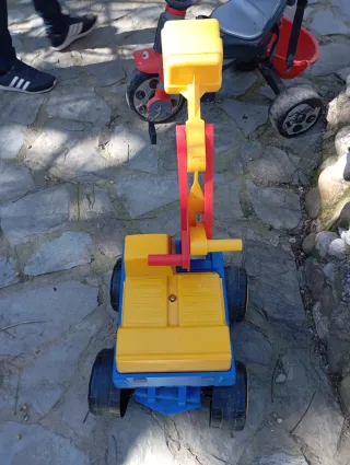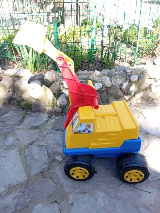 Divertida excavadora de juguete para niños, ideal para jugar en el arenero o en el jardín. Fabricada en plástico resistente y con un diseño llamativo. - Excavadora de color amarillo y azul. - Brazo articulado de color rojo con pala. - Ruedas grandes y negras con detalles amarillos.