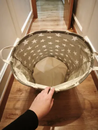 Práctico cesto de tela con un divertido diseño de estrellas blancas sobre fondo gris. Ideal para organizar juguetes o ropa. - Diseño de estrellas blancas. - Material de tela resistente. - Asas para facilitar el transporte.