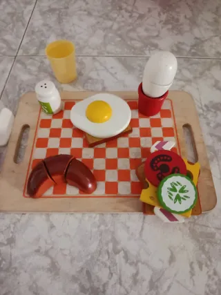 Set de juego de madera para preparar un desayuno. - Tabla de cortar con diseño a cuadros. - Incluye huevo frito, Croussant, pan y vaso. - Accesorios de comida de juguete todo de madera
